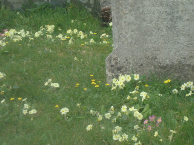We shouldn't go too close to another person. But it is alright to walk in empty fields and look at the sea. We walked today without seeing any neighbours. The lane is very slippery and muddy. The field is full of cut cauliflower stalks and some turnips growing as weeds (seeds mixed by chance, perhaps). We won't starve! The churchyard is very pretty - prettier than the field. There are lots of primroses and celandines among the gravestones.